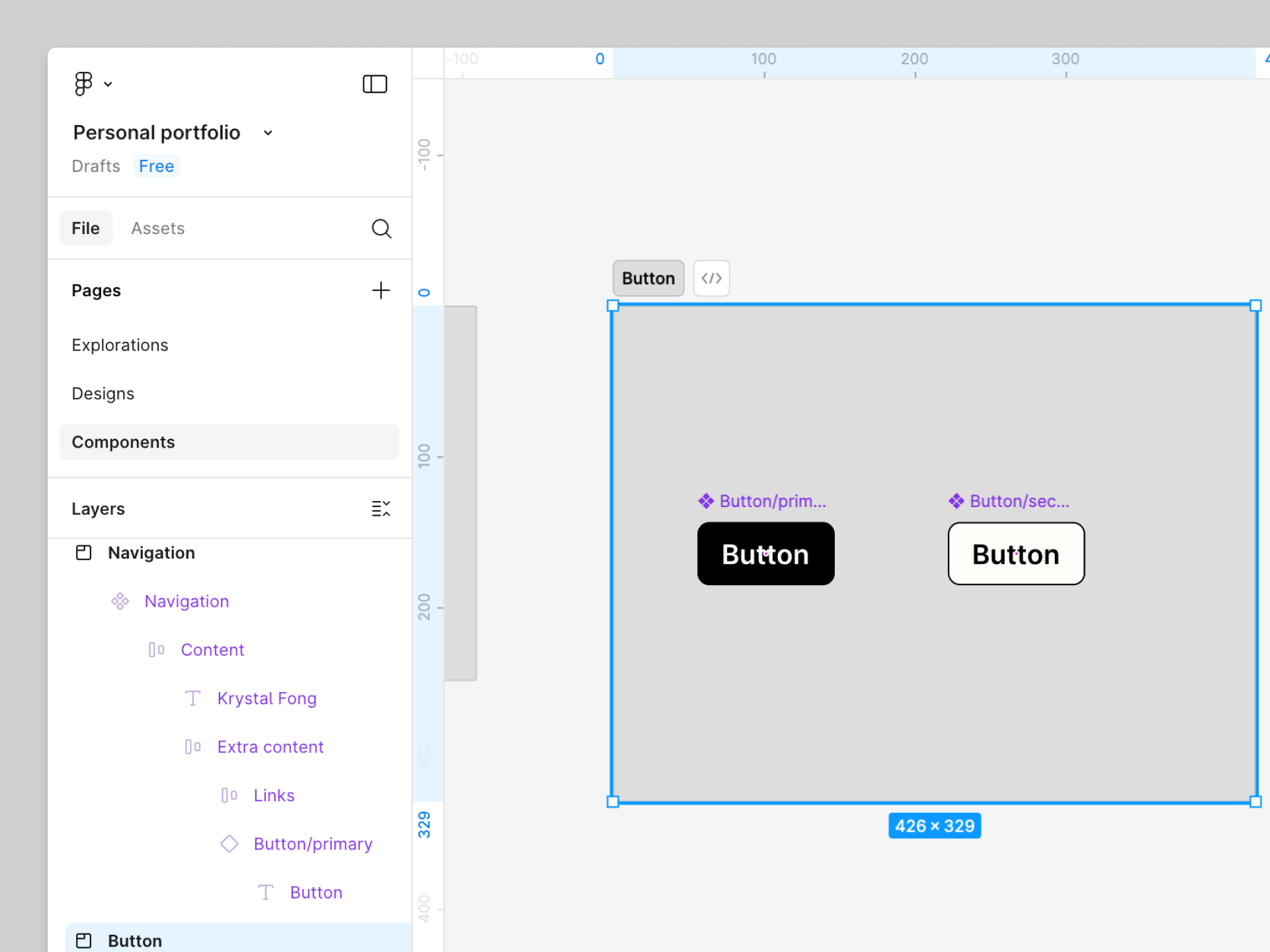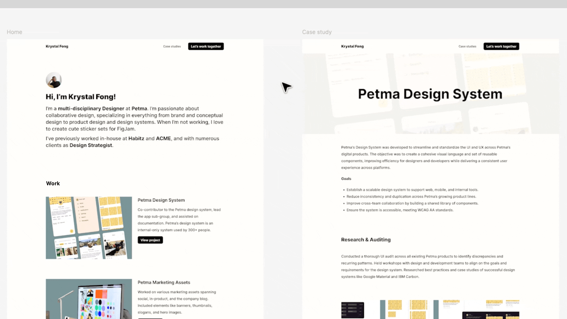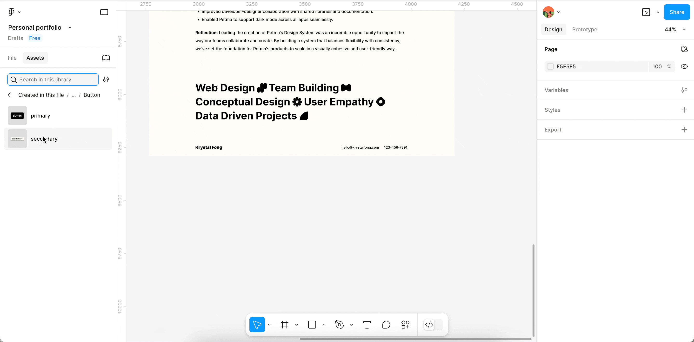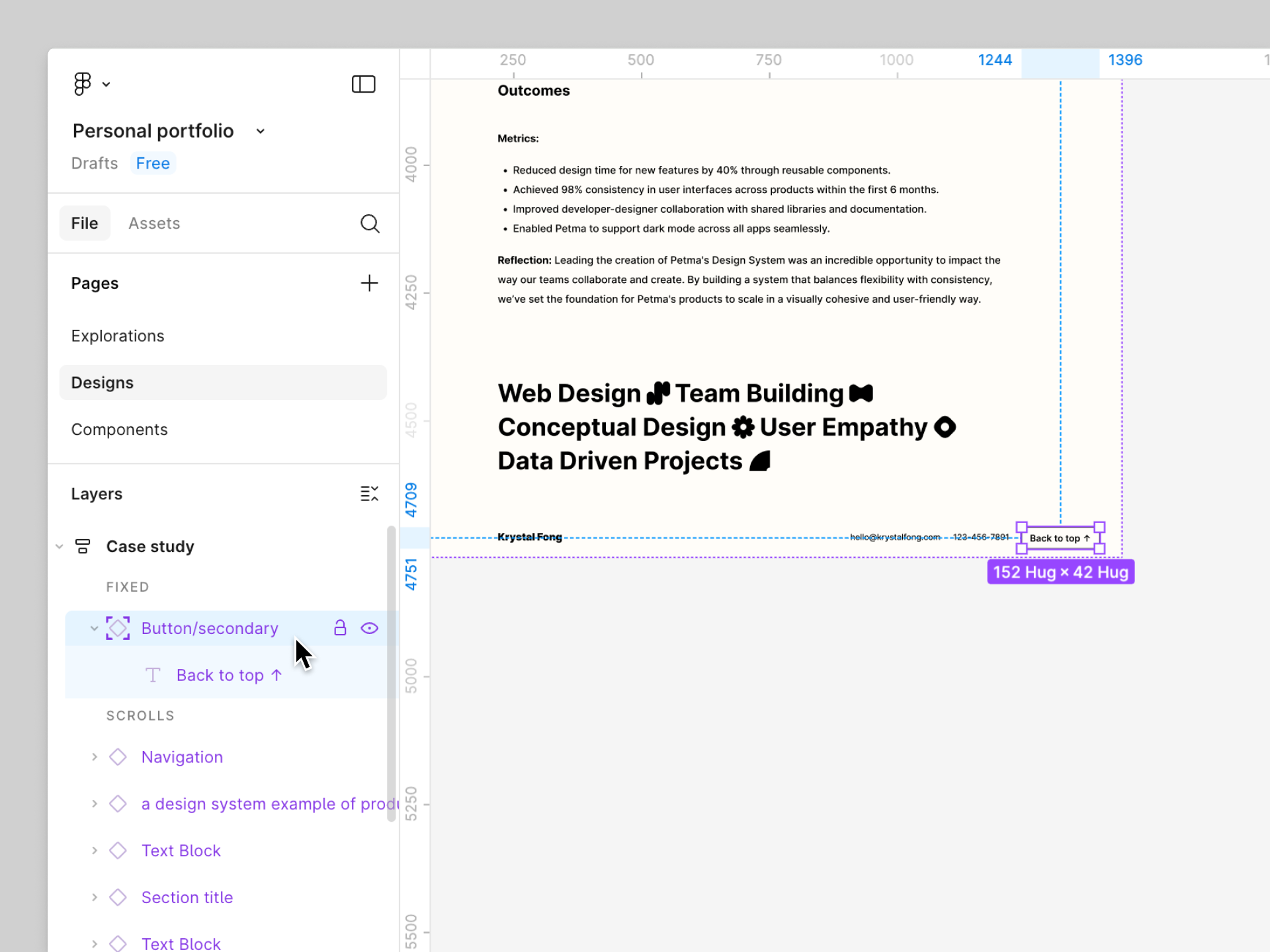 ポートフォリオデザインに戻り、この新しいボタンをケーススタディページにインスタンスとして追加しましょう。Figmaは、新しいボタンを自動的にオートレイアウトのフローに追加します。