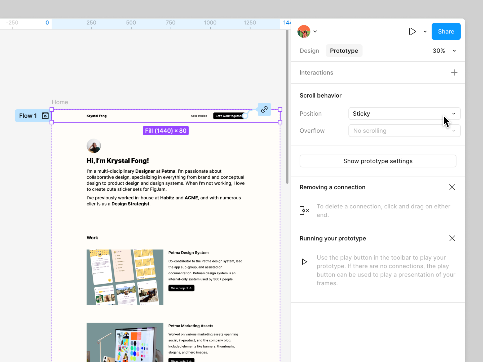 プロトタイプタブで、ボタンの位置を固定に変更します。位置が固定に設定されたレイヤーは、Figmaではスクロールする他のレイヤーの上に、レイヤーパネルの新しいセクションに移動します。