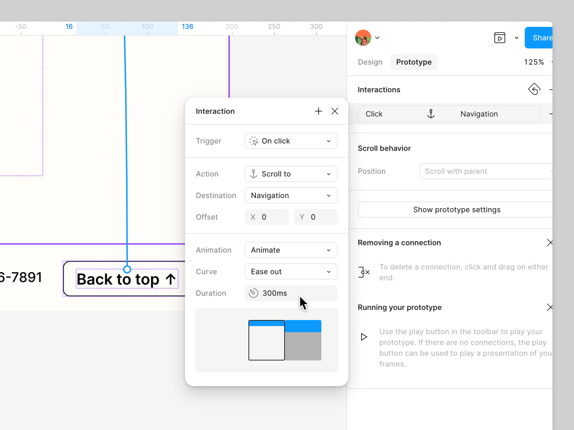次にスクロールはFigma Designでユーザーを同じフレーム内の特定のオブジェクトに移動させるアクションです。このアクションを使うことで、ボタンをクリックしたときにページのトップまでスクロールさせることができます。このインタラクションを追加する方法はいくつかあるので、ここでは2つの方法を一緒に見ていきましょう: