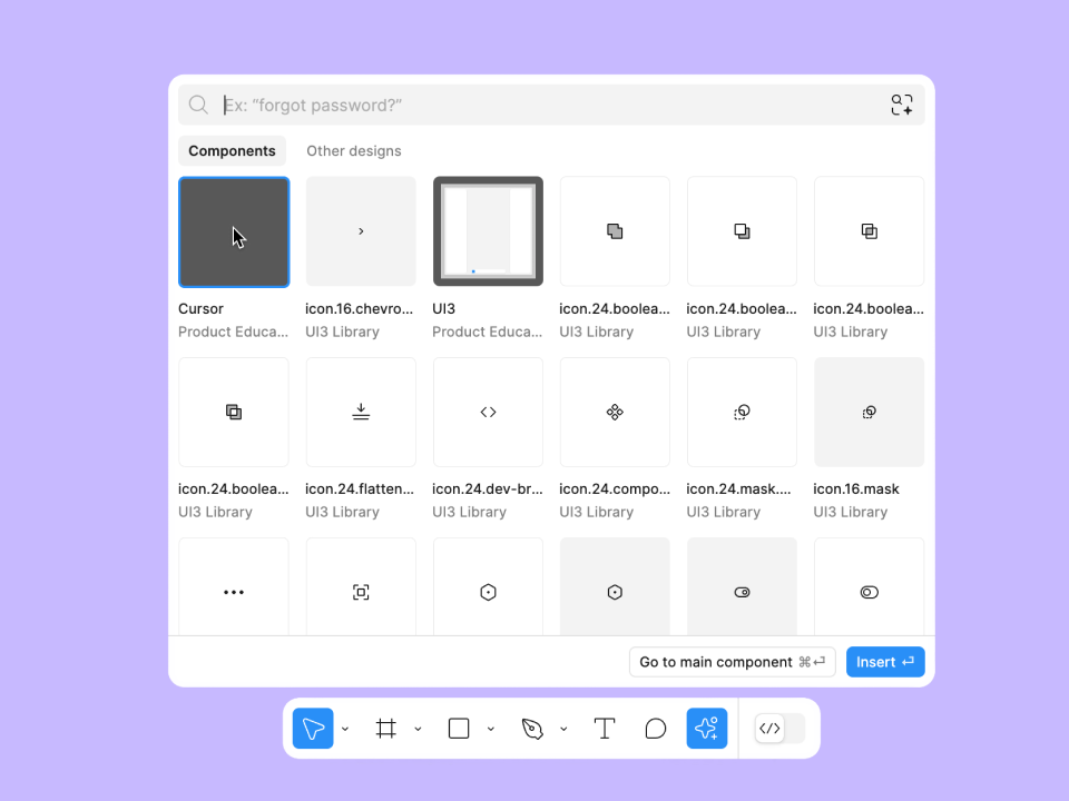 クイックインサートを使用して、キーボードからコンポーネントのインスタンスを挿入します。クイックインサートでは、[リソース]モーダルが開きます。このモーダルで有効なライブラリでコンポーネントを検索して表示することができます。