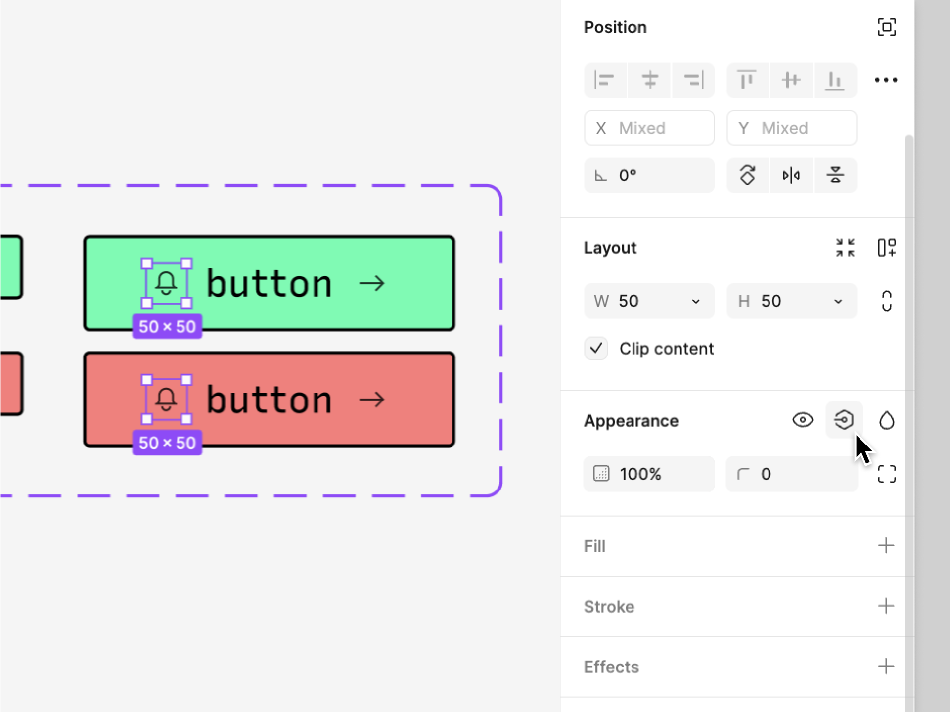 ヒント: メインコンポーネントまたはメインバリアントの任意のネストされたレイヤーからブール型プロパティを作成して適用できます。ネストされたレイヤーを選択し、[外観]セクションを見つけて、プロパティを適用アイコンをクリックします。プロパティを作成すると、それが選択したレイヤーに適用されます。