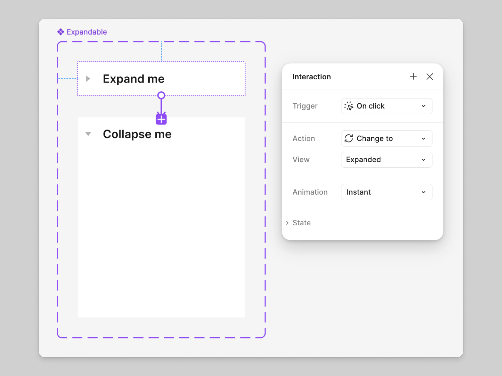 Você também pode usar a ação Mudar para em uma instância aninhada para alterar a variante do componente pai. No exemplo abaixo, uma variante de um conjunto de componentes está aninhada dentro de outro conjunto de componentes Expansível. Uma interação de Alterar para é colocada na instância aninhada para mudar o componente pai de sua variante Recolhida para sua variante Expandida.